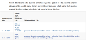 · dítěti může být udělen odklad povinné školní docházky, o udělení odkladu rozhoduje ředitel školy na základě písemné žádosti rodičů, k níž jsou přiloženy dva odborné posudky – posudek školského poradenského zařízení a posudek odborného lékaře nebo klinického psychologa, žádost se podává v době zápisu,